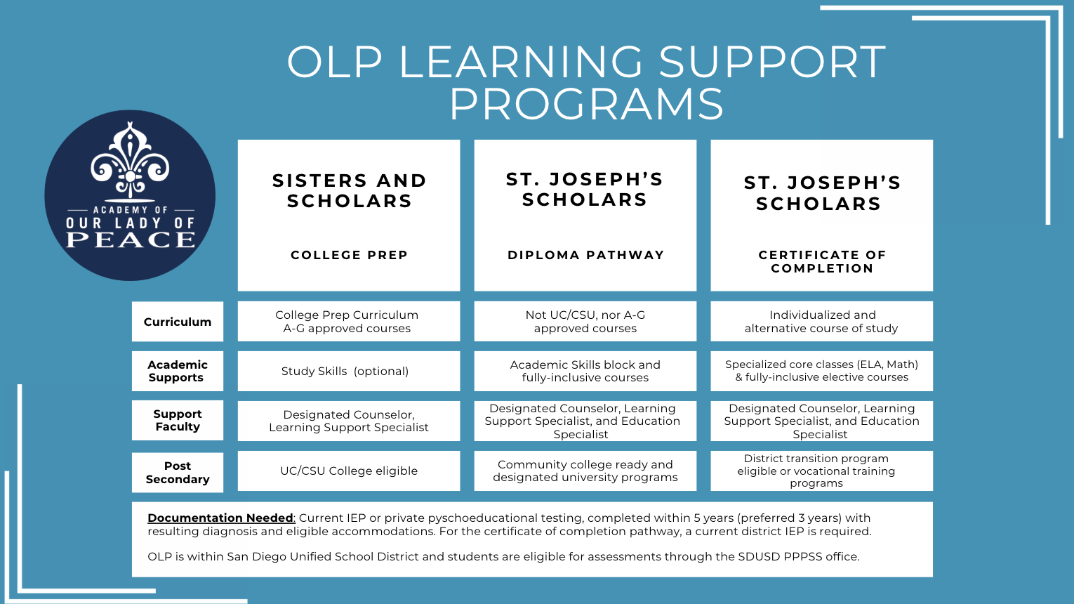 The Sisters and Scholars Program is an academic support program for students with identified learning disabilities, other medical conditions that affect learning, and students who have been struggling to demonstrate consistent, academic progress. Candidates for the program will need to provide the school with recent psycho-educational testing and/or an IEP/ISP that states the diagnosis and the recommended accommodations. The testing will be necessary for accommodations on the SAT, ACT, and AP exams as well as eventual accommodations at the college level. The CollegeBoard website lists tests that can be used to document a need for accommodations due to a learning disability. OLP required documentation to be up to date (within 3 years).